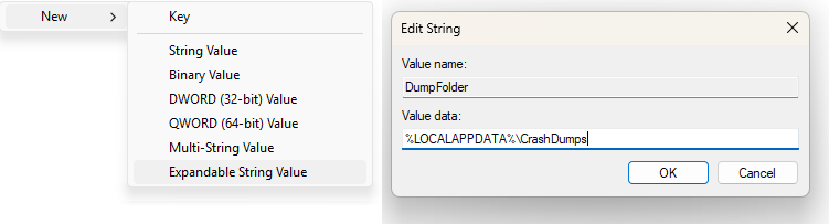 4. Next, right-click the empty space below "(Default)" and select New > Expandable String Value. Name this String "DumpFolder". You'll then be able to double-click the Value to edit it. Enter %LOCALAPPDATA%\CrashDumps in the Value data field and click OK.