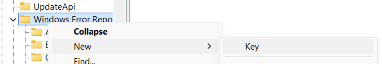 HKEY_LOCAL_MACHINE\SOFTWARE\Microsoft\Windows\Windows Error Reporting3. Right click the "Windows Error Reporting" Key in the left side bar, and select New > Key. Name the new key LocalDumps